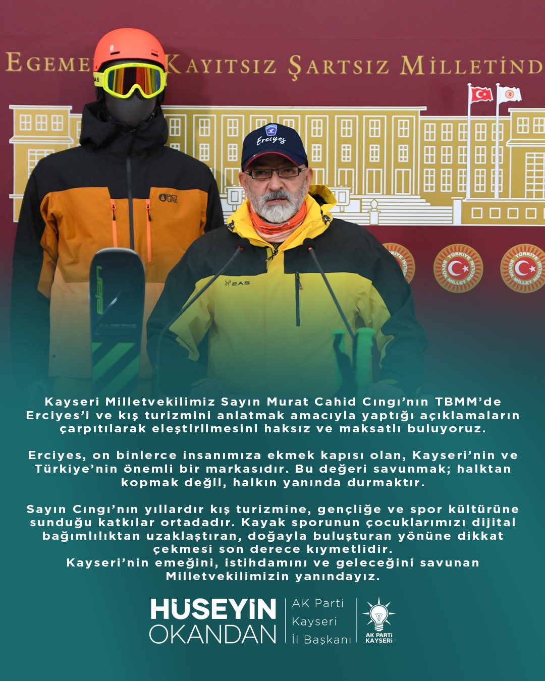AK Parti Kayseri İl Başkanı Hüseyin Okandan, Kayseri Milletvekili Murat Cahid Cıngı’nın geçtiğimiz günlerde Türkiye Büyük Millet Meclisi’nde (TBMM) kış turizmi ve Erciyes üzerine yaptığı konuşmanın ardından gelen eleştiriler üzerine yazılı bir açıklama yayımladı.