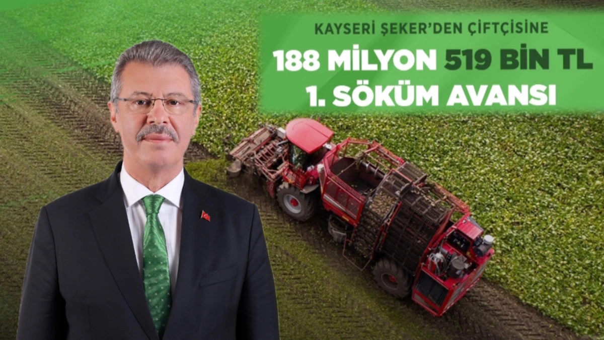 Kayseri Şeker, pancar üreticilerine destek kapsamında üç bölgede toplam 188 milyon 519 bin 774 TL tutarında birinci söküm avansı ödemesi gerçekleştirdi. Başkan Hüseyin Akay, üreticilerin her zaman öncelikleri arasında yer aldığını vurguladı.