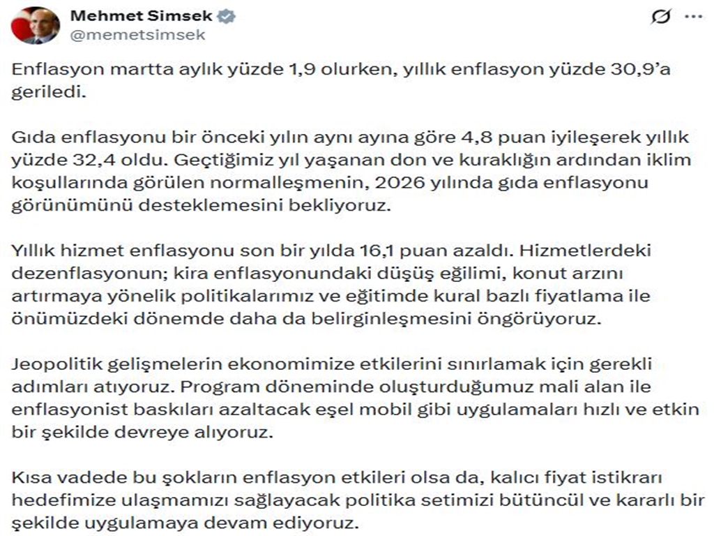 Hazine ve Maliye Bakanı Mehmet Şimşek, mart ayı enflasyon verilerine ilişkin sanal medya hesabından açıklama yaptı. Şimşek, "Enflasyon martta aylık yüzde 1,9 olurken, yıllık enflasyon yüzde 30,9’a geriledi. Gıda enflasyonu bir önceki yılın aynı ayına göre 4,8 puan iyileşerek yıllık yüzde 32,4 oldu. Geçtiğimiz yıl yaşanan don ve kuraklığın ardından iklim koşullarında görülen normalleşmenin, 2026 yılında gıda enflasyonu görünümünü desteklemesini bekliyoruz. Yıllık hizmet enflasyonu son bir yılda 16,1 puan azaldı. Hizmetlerdeki dezenflasyonun; kira enflasyonundaki düşüş eğilimi, konut arzını artırmaya yönelik politikalarımız ve eğitimde kural bazlı fiyatlama ile önümüzdeki dönemde daha da belirginleşmesini öngörüyoruz" dedi.