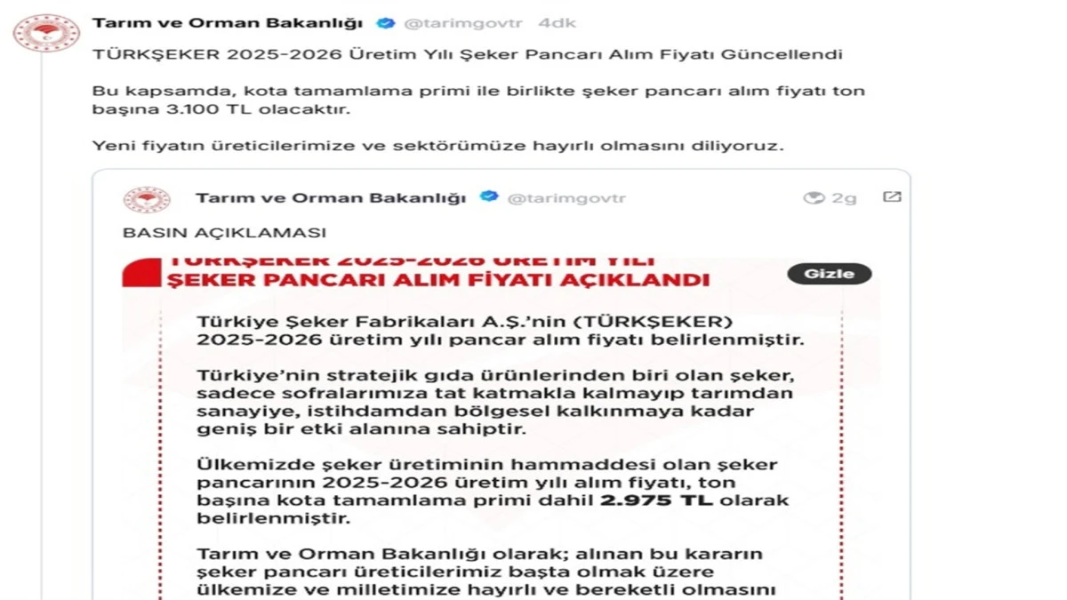 TARIM ve Orman Bakanlığı, Türkiye Şeker Fabrikaları A.Ş. (TÜRKŞEKER) tarafından 2025-2026 yılı şeker pancarı alım fiyatının kota tamamlama primi ile birlikte ton başına 3 bin 100 TL olarak güncellendiğini duyurdu.