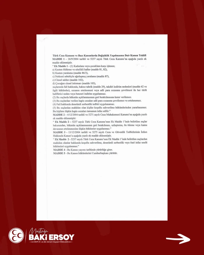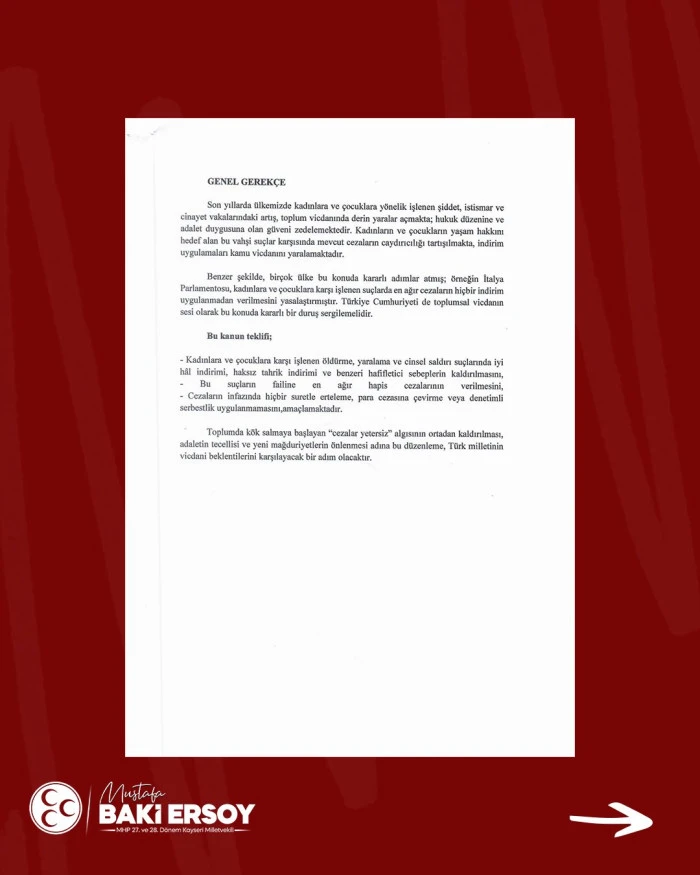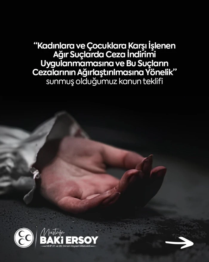 Kayseri’deki kadın cinayetinin ardından cezasızlığa karşı mücadele sözü veren MHP Milletvekili Baki Ersoy, kadınlara ve çocuklara yönelik suçlarda ceza indiriminin kaldırılmasına ilişkin teklifini TBMM’ye sundu.