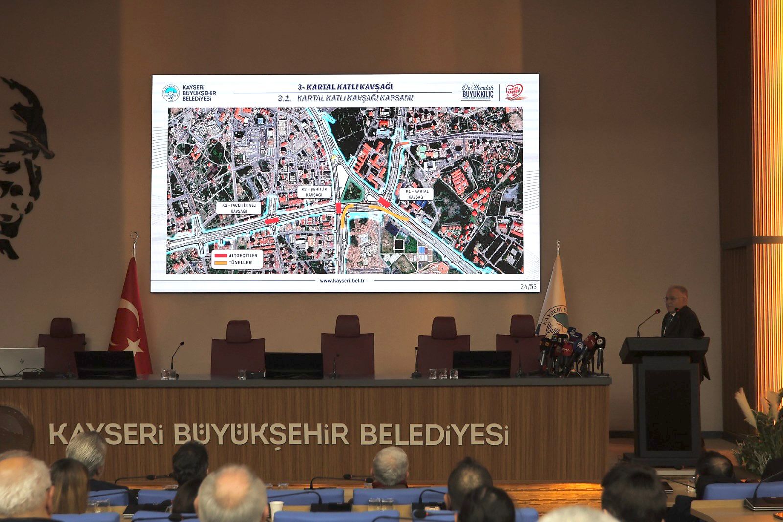 Kayseri Büyükşehir Belediye Başkanı Dr. Memduh Büyükkılıç, Büyükşehir Belediyesi Meclis Salonu’nda düzenlenen " Kartal Kavşağı Basın Bilgilendirme Toplantısı"nda yaygın ve yerel basın temsilcileriyle bir araya geldi. Sunum eşliğinde projenin teknik detaylarını, maliyetini ve alternatif güzergâhları anlatan Büyükkılıç, Kayseri’nin vizyon projelerinden birini daha hayata geçirmenin heyecanını yaşadıklarını belirtti.