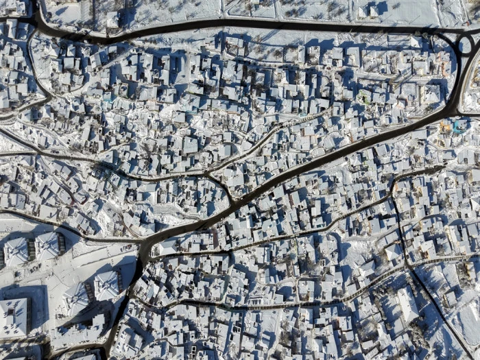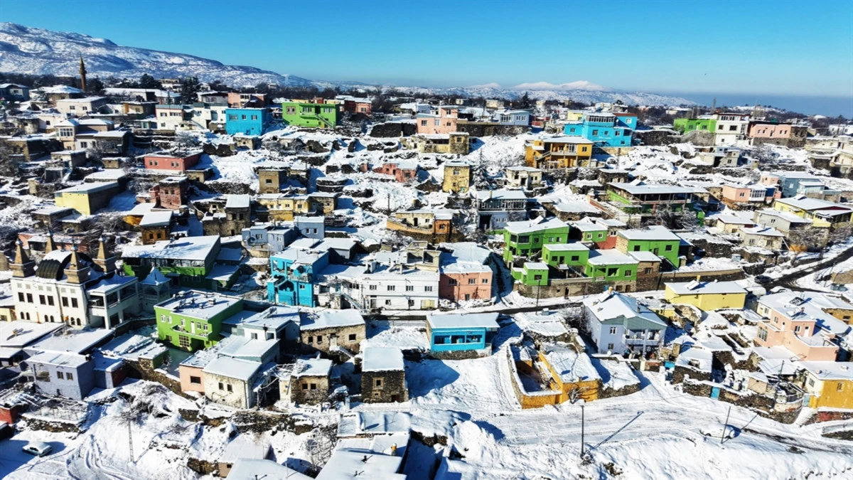 KAYSERİ'nin Hacılar ilçesinde kar yağışı sonrası çatıları beyaz örtüyle kaplanan yüzlerce renkli ev, dronla havadan görüntülendi.