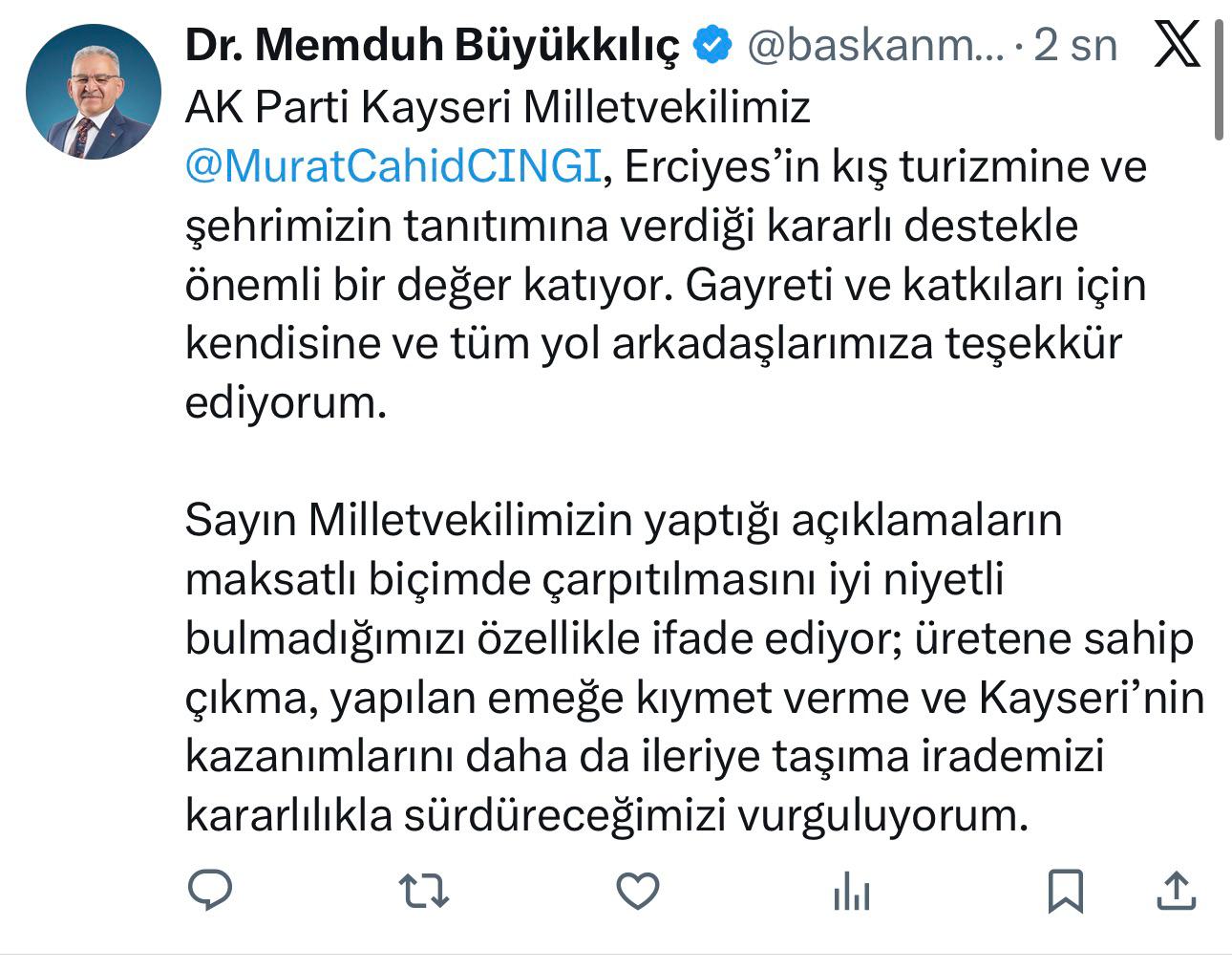 Kayseri Büyükşehir Belediye Başkanı Dr. Memduh Büyükkılıç, AK Parti Kayseri Milletvekili Murat Cahid Cıngı’nın kamuoyuna yansıyan beyanatları hakkında bir açıklama yaparak, ifadelerin saptırıldığını savundu ve Cıngı’ya destek verdi.