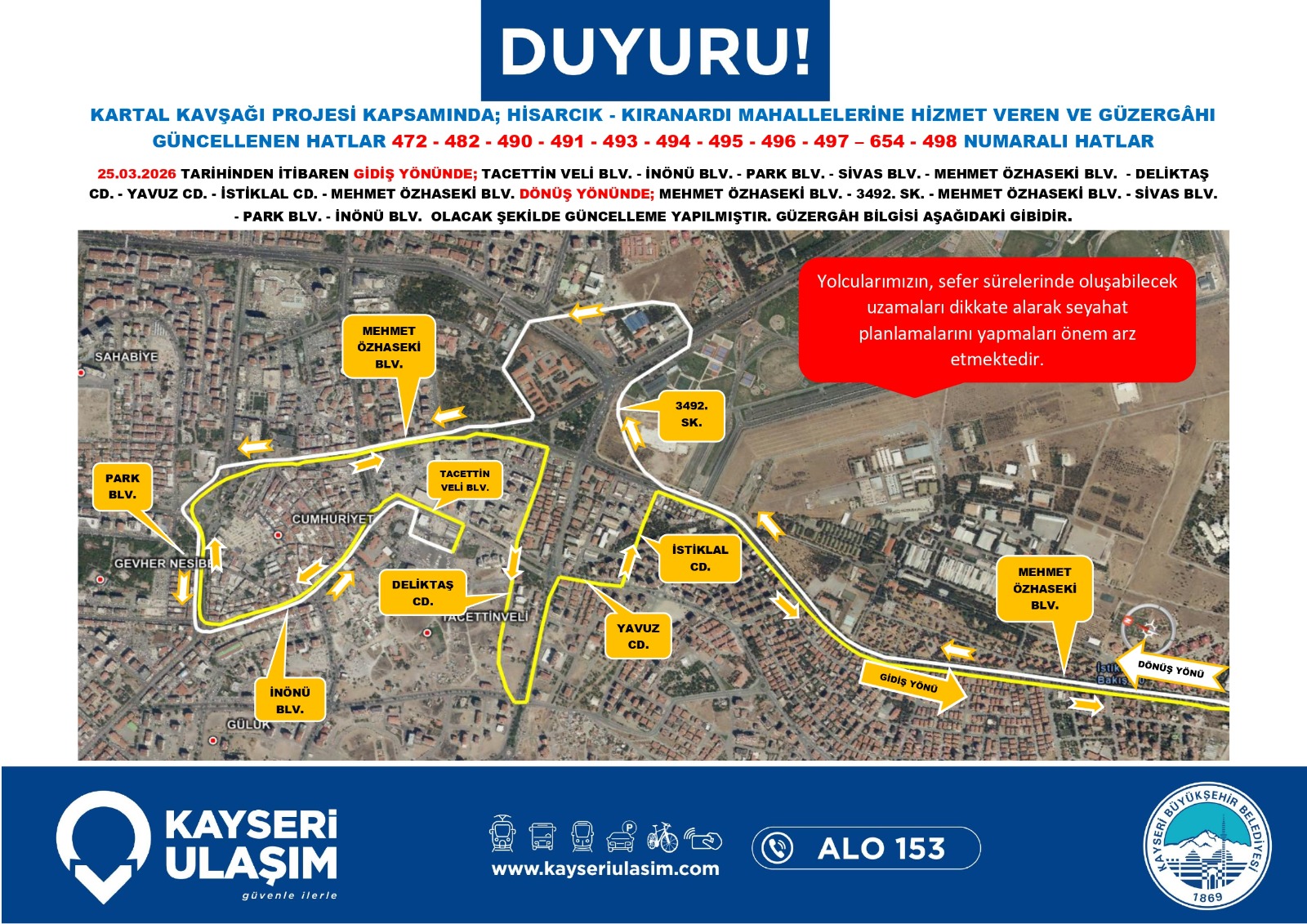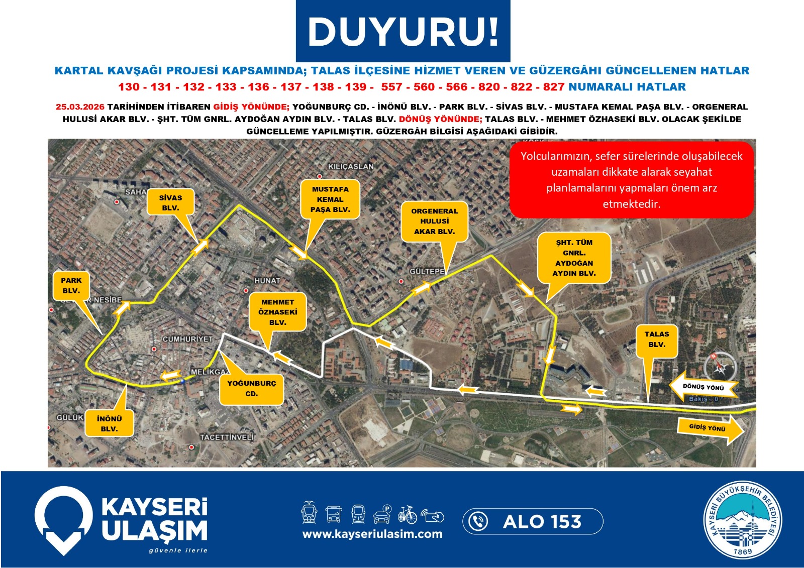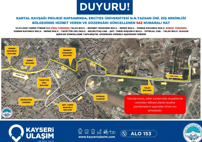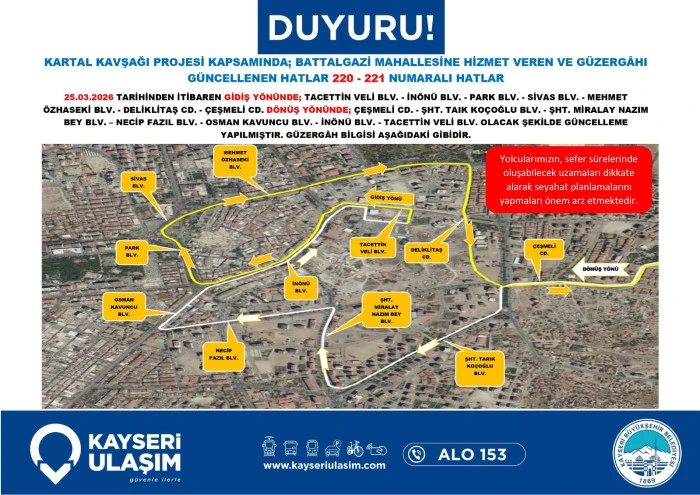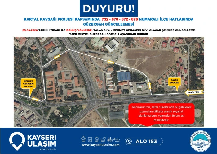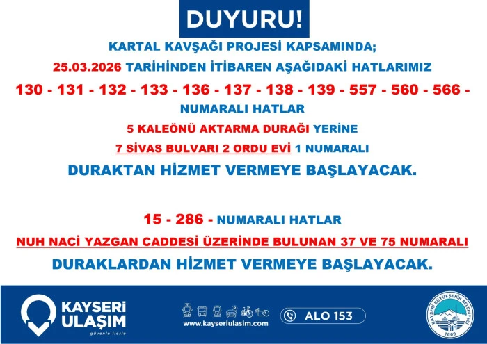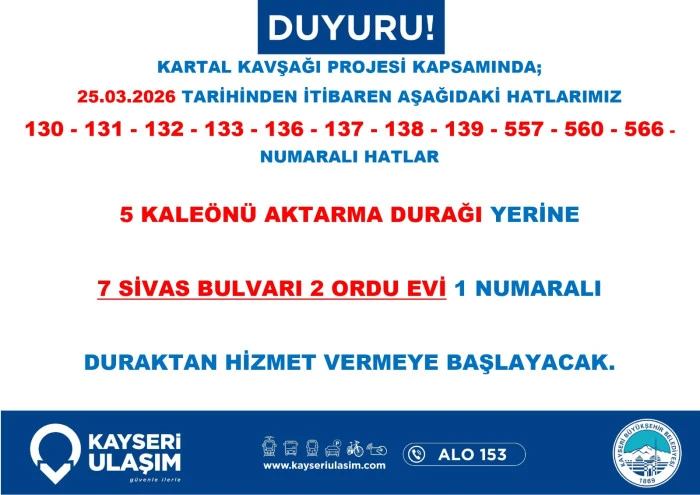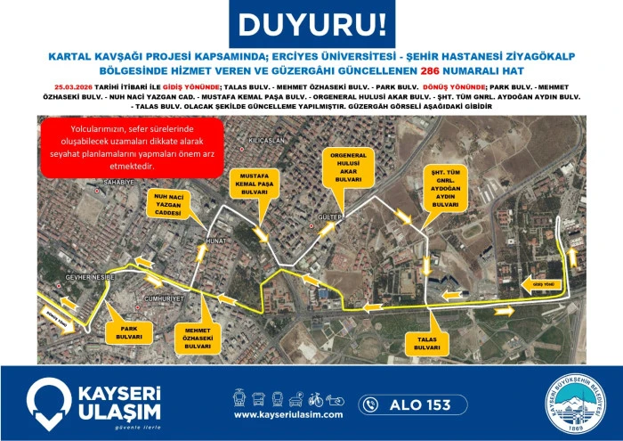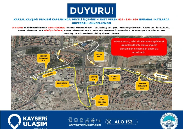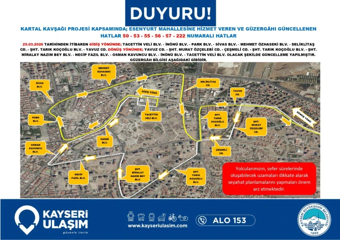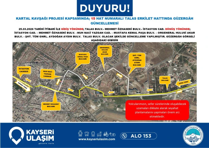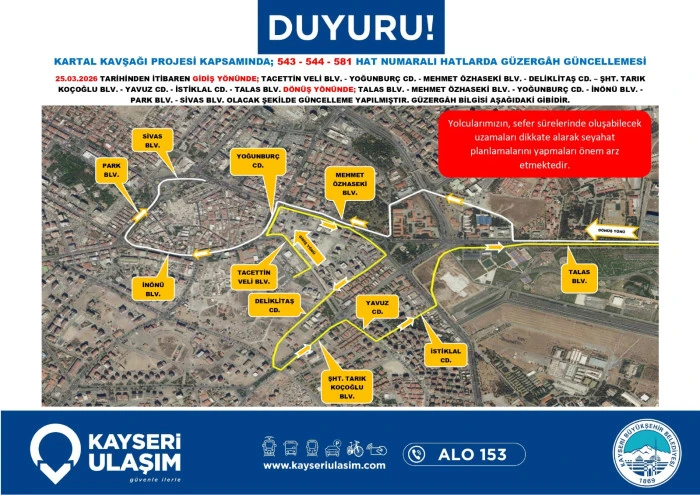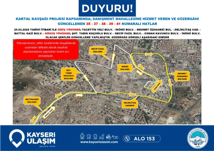 Kayseri Ulaşım A.Ş. de dev proje nedeniyle toplu taşıma hizmetlerinde düzenlemeye gidildiğini bildirdi. Yapılan açıklamada, bölgeden geçen otobüs hatlarının belirlenen geçici güzergâhları kullanacağı, bu durumun sefer sürelerinde kısmi uzamalara neden olabileceği ifade edildi. Yetkililer, vatandaşların güncel sefer saatlerini ve durak bilgilerini belediyenin resmi kanalları üzerinden takip etmeleri ve seyahat planlarını bu doğrultuda güncellemeleri yönünde çağrıda bulundu.