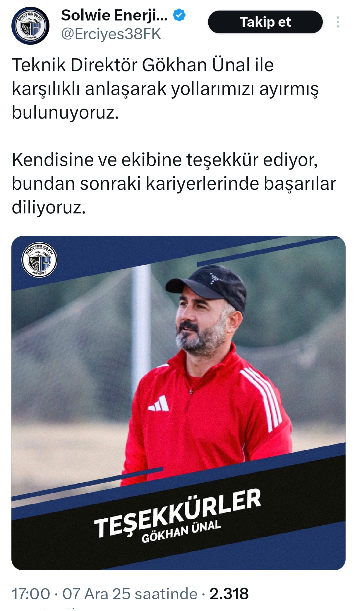 Kayseri temsilcisi Erciyes 38 Futbol Kulübü, teknik direktörlük görevini yürüten Gökhan Ünal ile karşılıklı anlaşmaya vararak yollarını ayırdığını resmen duyurdu.