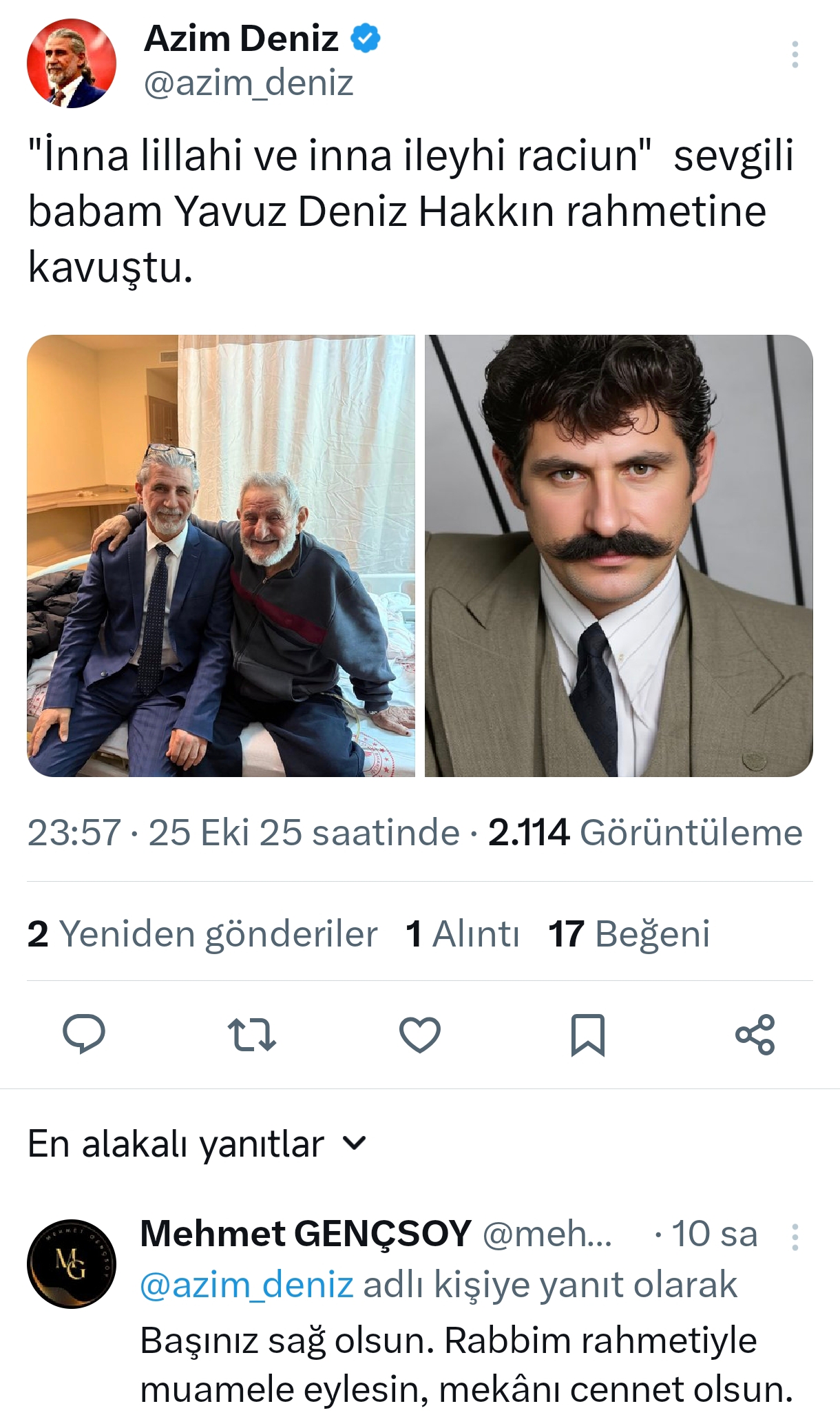 Bizlerde Türk360 Medya ailesi olarak değerli meslektaşımız Azim Deniz'e ve ailesine ve sevenlerine başsağlığı diliyoruz.