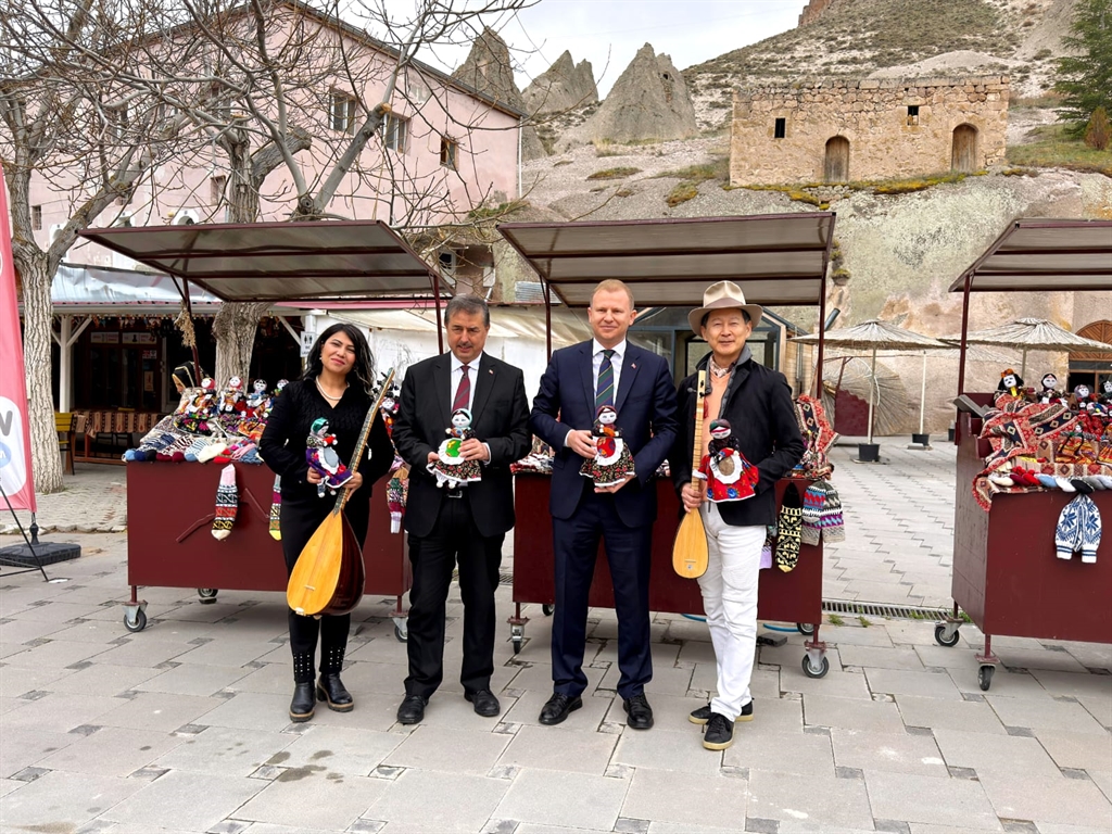 Tokyo’da yaşayan sanatçı Takeshi Imamuri, 10 yıl önce geldiği Türkiye’de, Türk müziğine ve kültürüne ilgi duymaya başladı. Sanal medyadan da Kayserili müzik öğretmeni Hülya Şen ile tanışan Japon sanatçı " class="text-dark font-weight-bold" target="_blank"> Japon sanatçı İmamuri, ülkesinden 12 bin 500 kilometre yol katedip geldiği Kayseri’de Kapadokya’nın doğu girişi olarak bilinen Yeşilhisar ilçesine özgü Soğanlı bez bebeklerini mahalleli kadınlar ile yaptı. Imamuri ardından da bölgenin önemli turizm destinasyonlarından Avla Kanyonu, kiliseleri ve sıcak hava balonları ile ünlü Soğanlı Ören Yeri'nde müzik öğretmeni Şen ile bağlama ve kopuz çaldı. Şen ve İmamuri'nin şimdiki hedefinde ise iki ülke arasında turizm elçiliği görevi üstlenebilmek var.