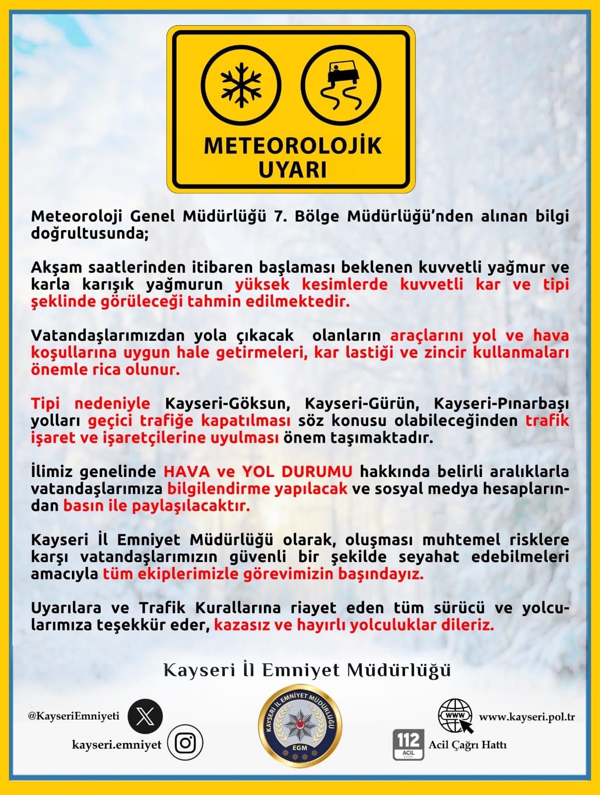 Emniyet Müdürlüğü, yola çıkacak vatandaşların araçlarını yol ve hava koşullarına uygun hale getirmeleri, kar lastiği ve zincir kullanmalarının büyük önem taşıdığına dikkat çekti. Tipi nedeniyle Kayseri-Göksun, Kayseri-Gürün ve Kayseri-Pınarbaşı yollarının geçici olarak trafiğe kapatılmasının söz konusu olabileceği vurgulanarak, sürücülerin trafik işaret ve işaretçilerine mutlaka uyması istendi.