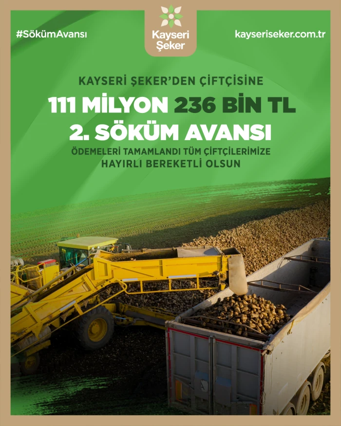 2025-2026 kampanya dönemi için Kayseri Şeker sözleşmeli ekim yapan çiftçilerine 111 milyon 236 bin 583 TL tutarında "2. Söküm avansı" ödemesi yaptı.