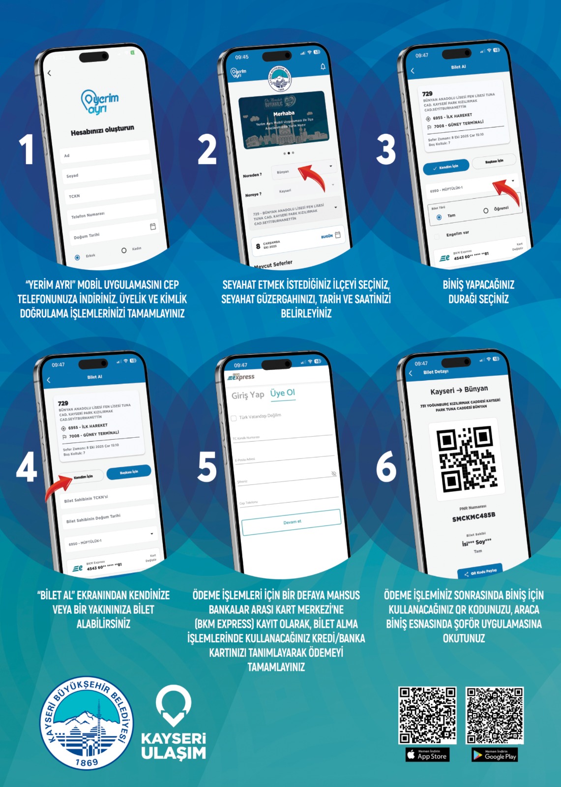 “Uygulama mağazalarından “Yerim Ayrı” mobil uygulamasını cep telefonunuza indiriniz. Üyelik ve kimlik doğrulama işlemlerini tamamlayınız. Seyahat etmek istediğiniz ilçeyi seçiniz. İlçe seçiminden sonra güzergâh, tarih ve saat bilgilerini belirleyiniz. Alt kısımda listelenen seferler arasından size uygun olanı seçiniz. Biniş yapacağınız durağı belirleyiniz. “Bilet al” ekranında kendiniz ya da bir yakınınız için bilet alabilirsiniz. Ödeme işlemleri için bir defaya mahsus Bankalar Arası Kart Merkezi’ne (BKM Express) kayıt olunuz ve kart bilgilerinizi tanımlayarak ödemeyi tamamlayınız. Satın alma işleminiz tamamlandığında oluşan QR kodu, araca biniş sırasında şoför uygulamasına okutarak yolculuğunuza başlayabilirsiniz.”