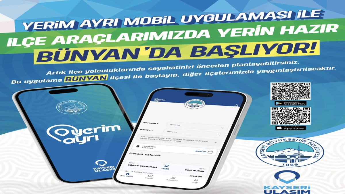 Kayseri Büyükşehir Belediyesi, bir ilke daha imza atarak, vatandaşların ilçe yolculuklarını önceden planlayabilmelerini sağlayacak "Yerim Ayrı" mobil uygulamasını hizmete sundu. Uygulama ilk olarak Bünyan ilçesinde 13 Ekim Pazartesi günü devreye alınıyor. Uygulamanın önümüzdeki süreçte diğer kırsal ilçelerde de yaygınlaştırılması planlanıyor.