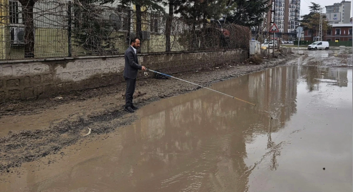 Saadet Partisi (SP) Kocasinan İlçe Başkanı Selçuk Onat, Sahabiye Mahallesi’nde yağış sonrası suyla kaplanan yola dikkat çekmek için oltayla balık tutmaya çalıştı.