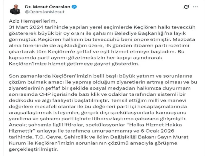 Keçiören Belediye Başkanı Özarslan, sanal medya hesabından yaptığı açıklamada, 31 Mart 2024 tarihinde yapılan yerel seçimlerde Belediye Başkanlığı'na seçildiğini hatırlatarak, "Keçiören halkının bu teveccühü beni onore etmiştir. Mazbata alma töreninde de açıkladığım üzere, ilk günden itibaren parti rozetimi çıkartarak tüm Keçiören'e şeffaf ve eşit hizmet etmeye başladım. Bu kapsamda parti ayrımı gözetmeksizin her kapıyı aşındırarak Keçiören’imize hizmet getirmeye gayret gösterdim. Son zamanlarda Keçiören’imizin belli başlı büyük yatırım ve sorunlarına çözüm bulmak amacı ile yapmış olduğum ziyaretlerin artmış olması ve bu ziyaretlerimin şeffaf bir şekilde sosyal medyadan halkımıza duyurmam sonrasında CHP içerisinde bazı klik ve odaklar tarafından sistemli bir dedikodu ve algı faaliyeti başlatılmıştır. Temsil ettiğim milli ve manevi değerlere mesafeli olanlar ile bu değerleri parti içi hesaplaşmalarında araçsallaştırmak isteyenler, gerçek dışı spekülasyonlarla kamuoyunu yanıltma ve şahsımı parti içinde itibarsızlaştırma çabasına girişmiştir. Ancak; şahsımla ilgili iftiralar, spekülasyonlar 'Halka hizmet hakka hizmettir' anlayışı ile tarafımca umursanmamış ve 6 Ocak 2026 tarihinde, T.C. Çevre, Şehircilik ve İklim Değişikliği Bakanı Sayın Murat Kurum ile Keçiören'imizin sorunlarının çözümü amacıyla görüşme gerçekleştirilmiştir" dedi.