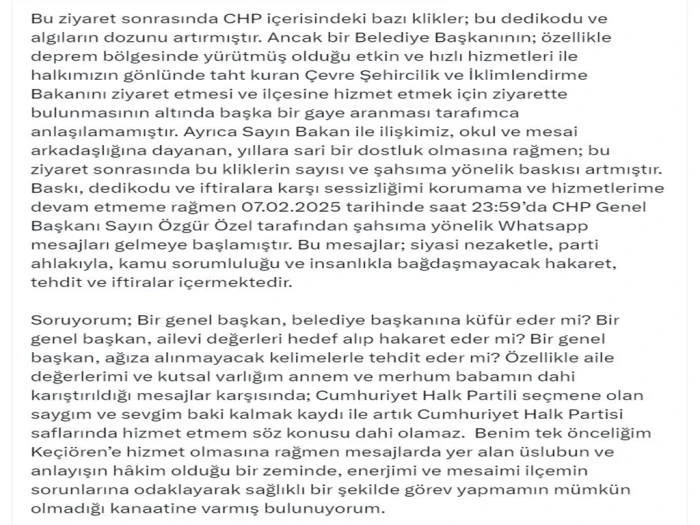 Bu ziyaret sonrasında CHP içerisindeki bazı kliklerin; bu dedikodu ve algıların dozunu artırdığını kaydeden Özarslan, "Ancak bir Belediye Başkanının; özellikle deprem bölgesinde yürütmüş olduğu etkin ve hızlı hizmetleri ile halkımızın gönlünde taht kuran Çevre Şehircilik ve İklimlendirme Bakanını ziyaret etmesi ve ilçesine hizmet etmek için ziyarette bulunmasının altında başka bir gaye aranması tarafımca anlaşılamamıştır. Ayrıca Sayın Bakan ile ilişkimiz, okul ve mesai arkadaşlığına dayanan, yıllara sari bir dostluk olmasına rağmen; bu ziyaret sonrasında bu kliklerin sayısı ve şahsıma yönelik baskısı artmıştır. Baskı, dedikodu ve iftiralara karşı sessizliğimi korumama ve hizmetlerime devam etmeme rağmen 7 Şubat 2025 tarihinde saat 23.59'da CHP Genel Başkanı Sayın Özgür Özel tarafından şahsıma yönelik Whatsapp mesajları gelmeye başlamıştır. Bu mesajlar; siyasi nezaketle, parti ahlakıyla, kamu sorumluluğu ve insanlıkla bağdaşmayacak hakaret, tehdit ve iftiralar içermektedir. Soruyorum; Bir genel başkan, belediye başkanına küfür eder mi? Bir genel başkan, ailevi değerleri hedef alıp hakaret eder mi? Bir genel başkan, ağıza alınmayacak kelimelerle tehdit eder mi? Özellikle aile değerlerimi ve kutsal varlığım annem ve merhum babamın dahi karıştırıldığı mesajlar karşısında; Cumhuriyet Halk Partili seçmene olan saygım ve sevgim baki kalmak kaydı ile artık Cumhuriyet Halk Partisi saflarında hizmet etmem söz konusu dahi olamaz. Benim tek önceliğim Keçiören'e hizmet olmasına rağmen mesajlarda yer alan üslubun ve anlayışın hakim olduğu bir zeminde, enerjimi ve mesaimi ilçemin sorunlarına odaklayarak sağlıklı bir şekilde görev yapmamın mümkün olmadığı kanaatine varmış bulunuyorum" ifadelerini kullandı.