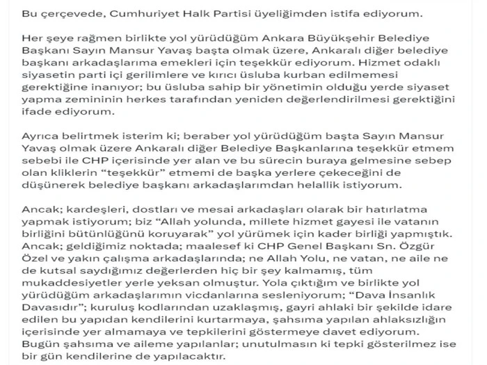"Tepkim; Cumhuriyet Halk Partisi’nin kurumsal kimliğine, Atatürkçü ve Cumhuriyetçi seçmenlerine değil; siyasi nezaketi ve devlet ciddiyetini yitirmiş mevcut yönetim anlayışınadır. Bu çerçevede, Cumhuriyet Halk Partisi üyeliğimden istifa ediyorum. Her şeye rağmen birlikte yol yürüdüğüm Ankara Büyükşehir Belediye Başkanı Sayın Mansur Yavaş başta olmak üzere, Ankaralı diğer belediye başkanı arkadaşlarıma emekleri için teşekkür ediyorum. Hizmet odaklı siyasetin parti içi gerilimlere ve kırıcı üsluba kurban edilmemesi gerektiğine inanıyor; bu üsluba sahip bir yönetimin olduğu yerde siyaset yapma zemininin herkes tarafından yeniden değerlendirilmesi gerektiğini ifade ediyorum. Ayrıca belirtmek isterim ki; beraber yol yürüdüğüm başta Sayın Mansur Yavaş olmak üzere Ankaralı diğer Belediye Başkanlarına teşekkür etmem sebebi ile CHP içerisinde yer alan ve bu sürecin buraya gelmesine sebep olan kliklerin 'teşekkür' etmemi de başka yerlere çekeceğini de düşünerek belediye başkanı arkadaşlarımdan helallik istiyorum. Ancak; kardeşleri, dostları ve mesai arkadaşları olarak bir hatırlatma yapmak istiyorum; biz 'Allah yolunda, millete hizmet gayesi ile vatanın birliğini bütünlüğünü koruyarak' yol yürümek için kader birliği yapmıştık. Ancak; geldiğimiz noktada; maalesef ki CHP Genel Başkanı Sayın Özgür Özel ve yakın çalışma arkadaşlarında; ne Allah yolu, ne vatan, ne aile ne de kutsal saydığımız değerlerden hiç bir şey kalmamış, tüm mukaddesiyetler yerle yeksan olmuştur. Yola çıktığım ve birlikte yol yürüdüğüm arkadaşlarımın vicdanlarına sesleniyorum; 'Dava insanlık davasıdır'; kuruluş kodlarından uzaklaşmış, gayri ahlaki bir şekilde idare edilen bu yapıdan kendilerini kurtarmaya, şahsıma yapılan ahlaksızlığın içerisinde yer almamaya ve tepkilerini göstermeye davet ediyorum. Bugün şahsıma ve aileme yapılanlar; unutulmasın ki tepki gösterilmez ise bir gün kendilerine de yapılacaktır. Keçiörenli hemşerilerimin emanetini layıkıyla taşımaya ve parti ayrımı gözetmeksizin ilçemiz için çalışmaya kararlılıkla devam edeceğim."