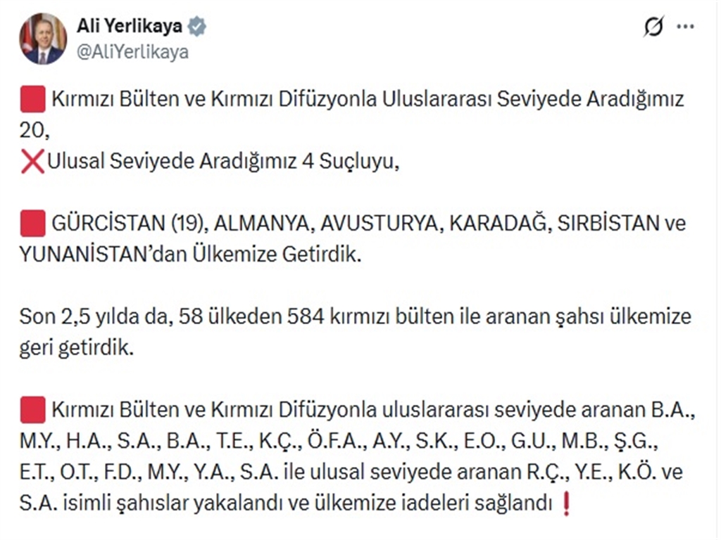 İçişleri Bakanı Ali Yerlikaya, kırmızı bülten, kırmızı difüzyon ve ulusal seviyeden aranan 24 suçlunun Gürcistan, Almanya, Avusturya, Karadağ, Sırbistan ve Yunanistan'da yakalanarak Türkiye'ye getirildiğini duyurdu.
