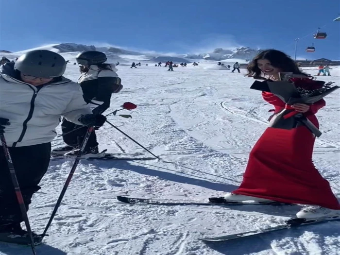 Kırmızı elbisesiyle Erciyes’te kayak yapıp, gül dağıttı