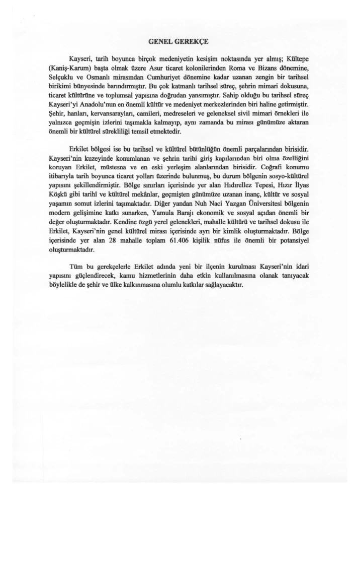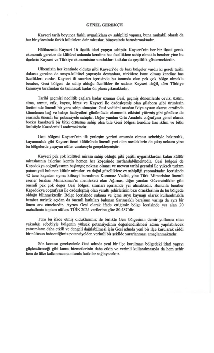 MHP Kayseri Milletvekilleri İsmail Özdemir ve Baki Ersoy tarafından hazırlanan Kayseri’nin Gesi ve Erkilet bölgelerinin ilçe statüsüne kavuşturulmasını öngören kanun teklifi TBMM’ye sunuldu. Teklifte, artan nüfus, genişleyen yerleşim alanları ve kamu hizmetlerine erişimde yaşanan yoğunluk gerekçe gösterilerek, söz konusu bölgelerin müstakil birer ilçe haline getirilmesinin hizmetlerin daha etkin ve verimli sunulmasına katkı sağlayacağı ifade edildi. Kayseri’nin tarih boyunca önemli medeniyetlere ev sahipliği yaptığına dikkat çekilen teklifte, özellikle Kültepe gibi merkezlerin şehrin köklü geçmişini ortaya koyduğu vurgulandı. Bu tarihsel birikimin günümüzde artan nüfus ve ekonomik gelişimle birlikte yeni bir idari düzenlemeyi gerekli kıldığı belirtilirken, Gesi ve Erkilet bölgelerinin sahip olduğu potansiyelin altı çizildi.