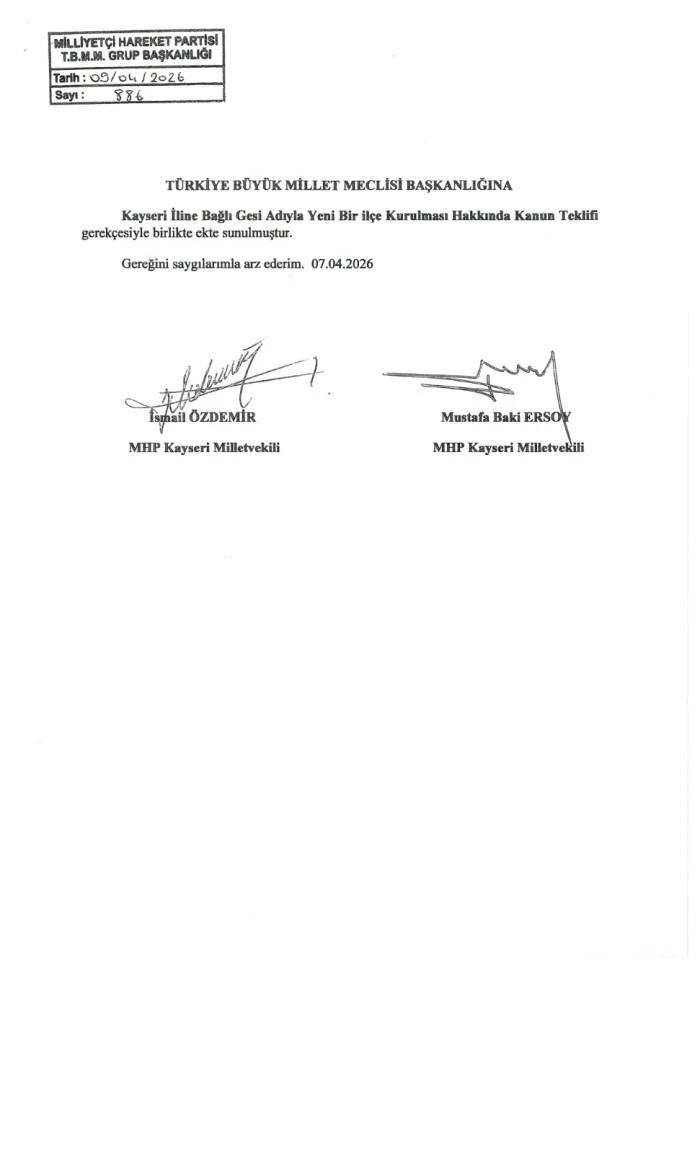 MHP Kayseri Milletvekilleri İsmail Özdemir ve Baki Ersoy, Gesi ve Erkilet bölgelerinin ilçe statüsüne kavuşturulmasını öngören kanun teklifini Türkiye Büyük Millet Meclisi’ne (TBMM) sundu.