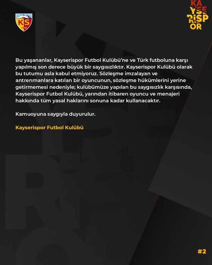 Sözleşmenin imzalanmasının ardından oyuncu, takımımızla birlikte antrenmana çıkmış; antrenman sonrasında ise burada olmaktan mutlu olduğunu ve memnuniyetini bizzat kendisi ifade etmiştir. Ancak ertesi sabah saat 09.59’da oyuncunun menajeri tarafından gönderilen bir mesajın ardından, oyuncu menajerinin baskısı ve yanlış yönlendirmesi sonucu, kulübümüzden herhangi bir izin alınmaksızın Kayseri’den ayrılmıştır. Bu yaşananlar, Kayserispor Futbol Kulübü’ne ve Türk futboluna karşı yapılmış son derece büyük bir saygısızlıktır. Kayserispor Kulübü olarak bu tutumu asla kabul etmiyoruz. Sözleşme imzalayan ve antrenmanlara katılan bir oyuncunun sözleşme hükümlerini yerine getirmemesi nedeniyle, kulübümüze yapılan bu saygısızlık karşısında Kayserispor Futbol Kulübü, yarından itibaren oyuncu ve menajeri hakkında tüm yasal haklarını sonuna kadar kullanacaktır.”