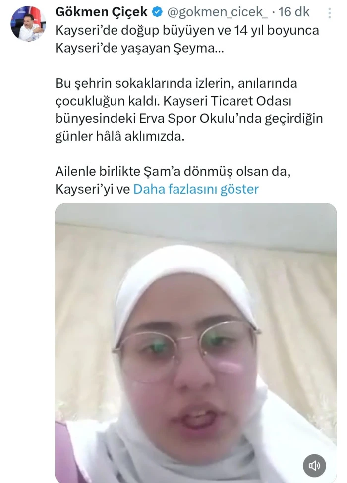 Kayseri’de doğup büyüyen ve 14 yıl boyunca kentte yaşayan Şeyma Hamade, Kayseri Ticaret Odası bünyesinde faaliyet gösteren Erva Spor Okulu’nda eğitim almıştı. Şam’a döndükten sonra Kayseri’ye olan özlemini dile getiren genç sporcu, hazırladığı video mesajı Vali Gökmen Çiçek’e iletti. Vali Çiçek de sosyal medya hesabından yaptığı paylaşımda Şeyma’ya hitaben, “Kayseri’de doğup büyüyen ve 14 yıl boyunca Kayseri’de yaşayan Şeyma. Bu şehrin sokaklarında izlerin, anılarında çocukluğun kaldı. Kayseri Ticaret Odası bünyesindeki Erva Spor Okulu’nda geçirdiğin günler hala aklımızda. Ailenle birlikte Şam’a dönmüş olsan da, Kayseri’yi ve arkadaşlarını özlediğini duymak bizi çok duygulandırdı. Biz de seni özledik Şeyma kızım. Kalbimiz hep seninle” ifadelerini kullandı.