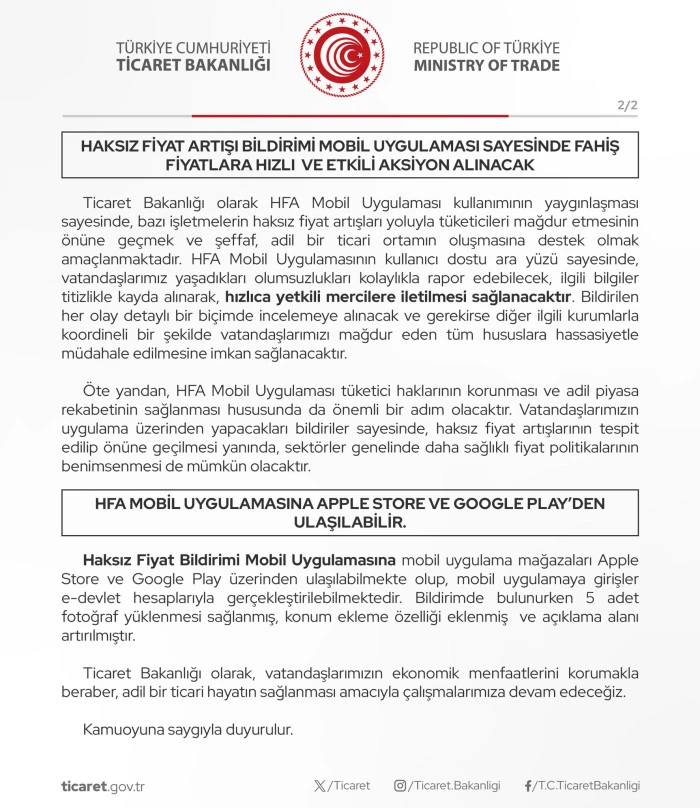 Ticaret Bakanlığı, konuya ilişkin yaptığı duyuruda; "Vatandaşlarımızın ekonomik menfaatlerini korumakla beraber, adil bir ticari hayatın sağlanması amacıyla çalışmalarımıza hassasiyetle devam edeceğiz" ifadelerine yer vererek, fahiş fiyatla mücadelenin aralıksız süreceği mesajını verdi.
