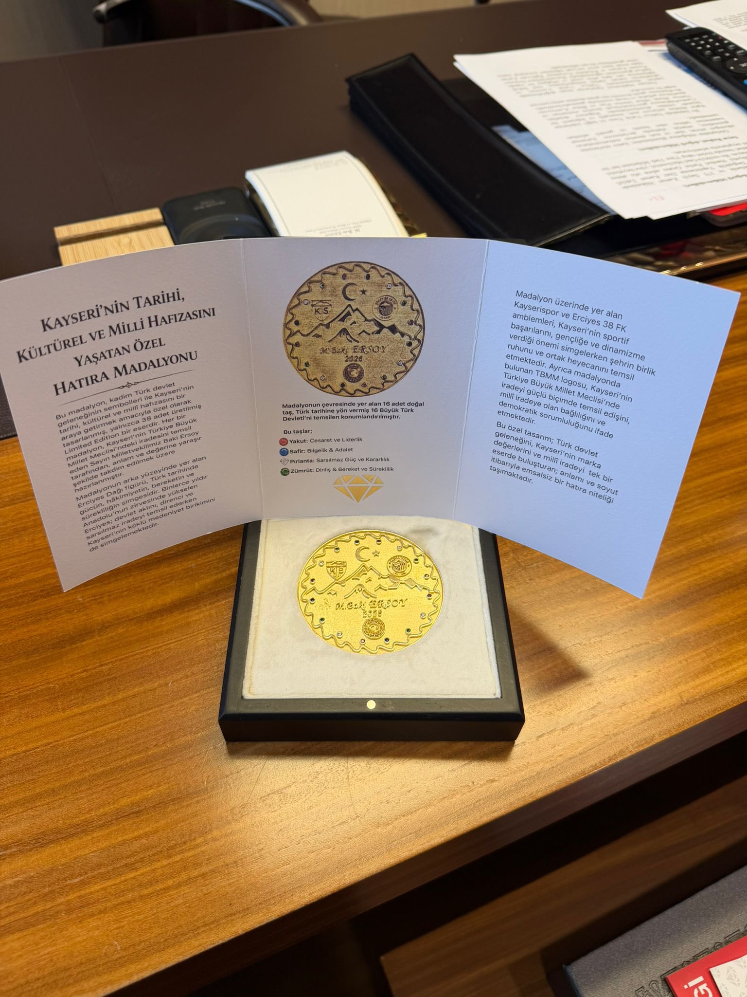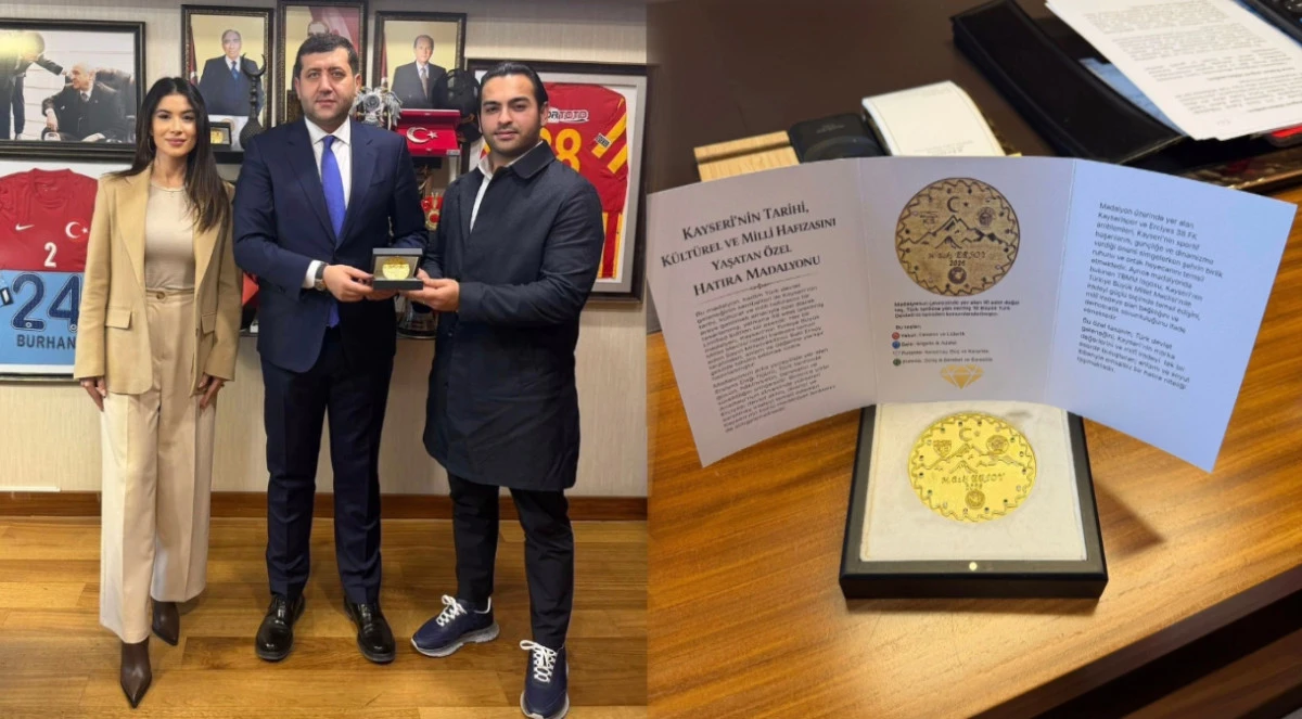 “Amore Kuyumculuk sahibi değerli kardeşim Batuhan Metin ve kıymetli eşi Suhan Metin, tasarımını ve üretimini gerçekleştirdikleri; 2026 yılına özel, 38 adet olarak hazırlattığımız, Türk dünyası ve Kayseri’mize ait değerlerin motiflerini taşıyan madalyonları teslim etmek üzere ziyaretime geldiler. Nazik ziyaretleri ve kıymetli emekleri için kendilerine teşekkür ediyor, çalışmalarında başarılar diliyorum” ifadelerine yer verdi.