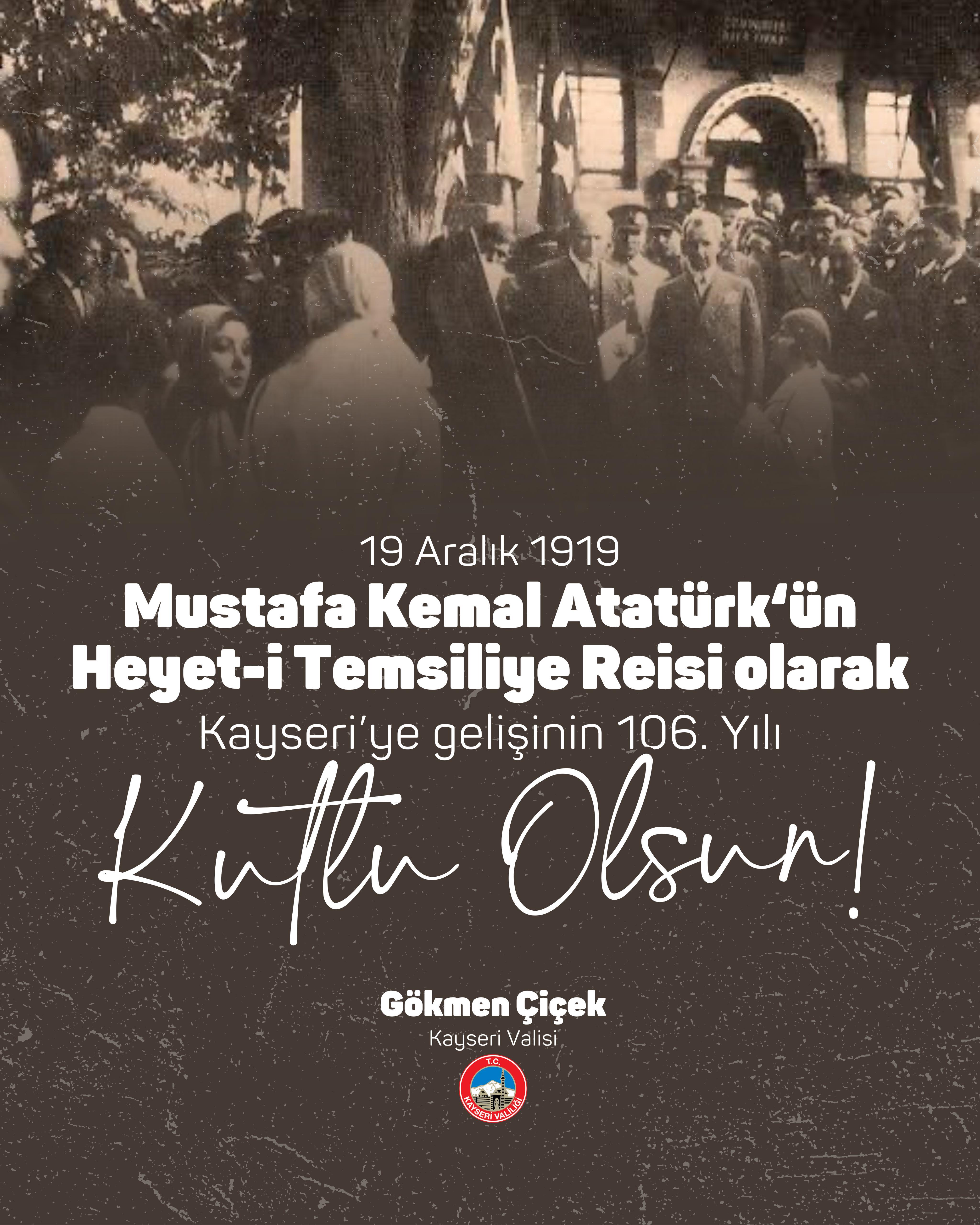 Valilikten yapılan yazılı açıklamada Vali Gökmen Çiçek, Atatürk’ün Kayseri’ye teşriflerinin yıl dönümünü gururla kutladıklarını belirterek, şu ifadelere yer verdi: