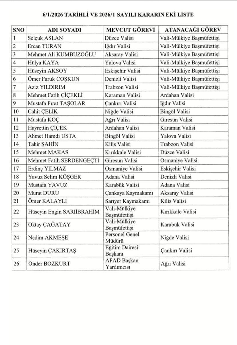 Türkiye’nin merakla beklediği Valiler Kararnamesi, Cumhurbaşkanı Recep Tayyip Erdoğan’ın imzasıyla Resmi Gazete’de yayımlandı. Kararnameye göre 7 ilin valisi merkeze çekilirken, toplamda 19 ilde valilik değişimi yaşandı. Kayseri kamuoyunda bir süredir devam eden "Vali Gökmen Çiçek başka bir göreve mi atanacak?" iddiaları ise son yayımlanan liste ile netlik kazandı.