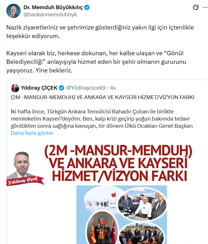 MHP Genel Başkan Basın Danışmanı ve Türkgün Gazetesi Başyazarı Yıldıray Çiçek, kaleme aldığı köşe yazısında Ankara Büyükşehir Belediyesi ile Kayseri Büyükşehir Belediyesi’ni karşılaştırdı. Çiçek, Kayseri Büyükşehir Belediye Başkanı Memduh Büyükkılıç’ın hizmet odaklı belediyecilik anlayışını öne çıkarırken, Ankara’da Mansur Yavaş dönemini “kayıp yıllar” olarak niteledi.