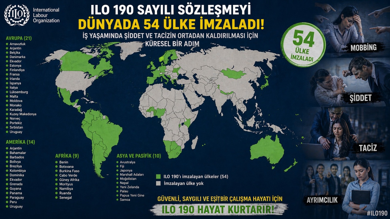 “Çalışma Yaşamında Şiddet ve Tacizin Önlenmesi” Uluslararası sözleşmesini imzalayan ülke sayısı Aralık 2025 itibariyle 54 ülke olmuştur.